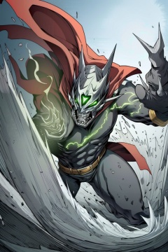 ((HRD, HUD, 8K)),((masterpiece, best quality)), highly detailed,Fight, 1boy, cape, male focus, weapon, holding, claws, glowing eyes, belt, glowing, solo, teeth, superhero, spikes, red cape, bodysuit, mask, green eyes, sharp teeth, monster, <lora:20240514-1715656820714:0.8>