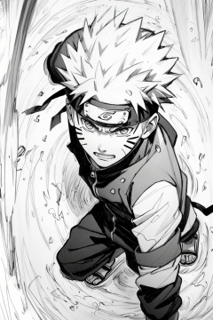 ((HRD, HUD, 8K)),((masterpiece, best quality)), highly detailed,Fight, monochrome, 1boy, greyscale, solo, male focus, forehead protector, uzumaki naruto, konohagakure symbol, sandals, ninja, looking at viewer, facial mark, spiked hair, whisker markings, from above, teeth, <lora:20240514-1715656820714:0.8>