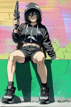 ((HRD, HUD, 8K)),((masterpiece, best quality)), highly detailed,Fight, 1girl, solo, hood, weapon, sneakers, gun, bandages, shoes, handgun, sitting, shorts, breasts, hoodie, hood up, holding, holding weapon, graffiti, holding gun, holster, <lora:20240514-1715656820714:0.8>