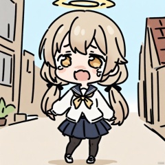 crying,chibi,(masterpiece, best quality),1girl,solo,long hair,blue eyes,in_summer,loli,(middle_breasts:1.1), hifumi-default,hifumi \(blue archive\),(yellow eyes:1.3),light brown hair,long hair,low twintails,halo,school uniform,blue sailor collar,white cardigan,pleated skirt,black pantyhose,sneakers ,holding_phone,outdoors,walking on street,looking to the side,standing_split,dutch angle,smiling,