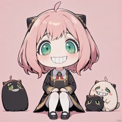 (grin, chibi, teeth),(masterpiece),(best quality),Anya Forger, 1girl, anya \(spy x family\), solo, female child, pink hair, green eyes, school uniform, eden academy school uniform, smile, dress, sitting, looking at viewer, open mouth, black footwear, black dress, child, shirt, :d, long sleeves, full body, shoes, medium hair, bangs, ahoge, white pantyhose, collared shirt