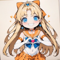 (grin, chibi, teeth),(masterpiece),(best quality),1girl,sailor venus,masterpiece,best quality,very aesthetic,absurdres,aavenus,long hair,blonde hair,hair bow,tiara,blue eyes,earrings,orange choker,collarbone,orange sailor collar,blue bowtie,white shirt,white leotard,elbow gloves,white gloves,pleated skirt,orange skirt,heart hands,traditional media,
