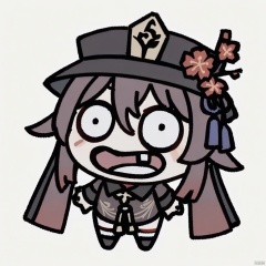 (chibi),full body,masterpiece, best quality, full shot, chibi, grimaces, emoji, frightening, 1girl, solo, long hair, looking at viewer, smile, open mouth, bangs, simple background, brown hair, long sleeves, hat, hair between eyes, twintails, flower, :d, chibi, nail polish, black eyes, black headwear, chinese clothes, black nails, hat ornament, emphasis lines, hat flower, claw pose, hu tao \(genshin impact\),