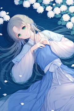 hanfu,1girl,solo,flower,long hair,green eyes,water,white flower,lying,looking at viewer,parted bangs,dress,long sleeves,petals,on side,partially submerged,ribbon,<lora:hansxl-gufeng:1>,