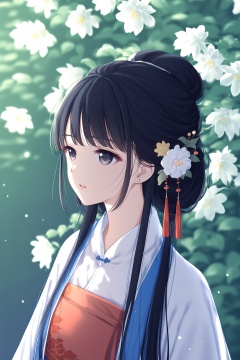 hanfu,1girl,flower,solo,upper body,long hair,black hair,hair ornament,parted lips,white flower,chinese clothes,blurry,hanfu,sash,<lora:hansxl-gufeng:1>,