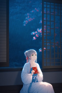masterpiece,best quality,illustration,ultra detailed,hdr,Depth of field,(colorful),hanfu,1girl,solo,green eyes,chinese clothes,rain,flower,window,night,wide sleeves,ribbon,long sleeves,grey hair,long hair,hair ribbon,indoors,branch,collarbone,looking up,holding,sitting,closed mouth,