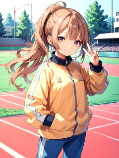 score_9,score_8_up,score_7_up,score_6_up,best quality,amazing quality,very aesthetic,1girl,solo,hand_in_pocket,ponytail,purple_eyes,brown_hair,looking_at_viewer,nakagawa_natsuki,smile,blue_pants,pants,closed_mouth,long_sleeves,yellow_background,v,jacket,long_hair,hand_up,standing,blue_jacket,simple_background,track_jacket,bangs,track_pants,track_suit,two-tone_background,