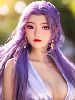 best quality,masterpiece,Yunxiao_Fairy,1girl,solo,long hair,looking at viewer,jewelry,closed mouth,purple eyes,upper body,purple hair,earrings,blurry,blurry background,sunlight,red lips,(big breasts:1.39)