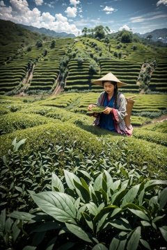 absurdres,incredibly absurdres,reality,realistic,,(solo:1.2), Picking in the tea fields_ (With the new leaves in his hands:1.2)