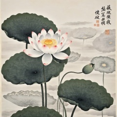 Lace,reference to Chinese Qi Baishi's prawn paintings,white background,light gray,thin texture,ancient paper texture,Chinese art,Song Dynasty,Xuan paper. Lotus,whether in full bloom or not,is light in color.,