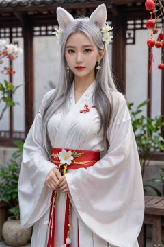 1girl, solo, long hair, breasts, looking at viewer, hair ornament, long sleeves, dress, animal ears, jewelry, very long hair, standing, flower, white hair, earrings, hair flower, wide sleeves, necklace, animal ear fluff, sash, chinese clothes, white flower, shawl, hanfu