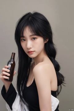 1girl, solo, long hair, looking at viewer, black hair, holding, bare shoulders, upper body, braid, sleeveless, looking back, mole, black eyes, lips, black shirt, bottle