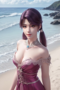 photo_\(medium\),(8k, RAW photo, best_quality),(masterpiece:1.2),(realistic:1.2),(photorealistic:1.3),(ultra-detailed),(extremely_detailed_cg_8k_wallpaper),(crystal_texture_skin:1.3),(shiny:1.2),(shiny_skin:1.4),(extremely_delicate_and_beautiful),shenfengLingLuoChen,1girl,solo,armor,purple dress,skirt,detached collar,skirt,torogao,bare shoulders,twintails,Cleavage,standing,jewelry,hair ornament,lips,earrings,necklace,realistic,looking at viewer,Summer,Beach,Sea,sunshine,<lora:shenfengLuoYan_20240514203344-000005:0.7>,