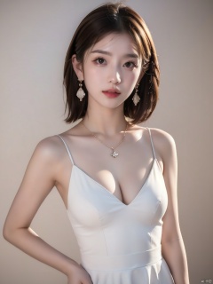 1girl,solo,realistic,jewelry,necklace,brown hair,dress,breasts,brown eyes,hands on hips,cleavage,earrings,lips,white dress,simple background,looking at viewer,medium breasts,short hair,makeup,fashion model,picture-perfect face,flowing hair,shiny skin,full body,full body,(Shooting background board,photostudio),(simple),(masterpiece, top quality),master piece,professional artwork,famous artwork,(realistic,photorealistic:1.37),HDR,UHD,8K,ultra realistic 8k cg,8K,32k,HD,