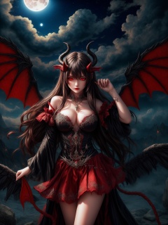 masterpiece, (best quality:1.4), [:intricate details:0.2], demon girl, skirt, red eyes, demon horns, demon wings, demon tail, enchanting gaze, captivating pose, otherworldly charm, mystical sky, moonlit night, cloud,