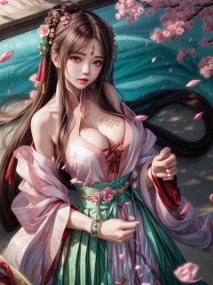 1girl,brown hair,hair ornament,upper body,solo,long hair,petals,breasts,facial mark,bare shoulders,jewelry,bracelet,large breasts,looking at viewer,cleavage,brown eyes,holding,chinese clothes,hanfu,pink short shan,gradient green pleated skirt,pink songmo,<lora:hanfuSong_v35:0.2>,