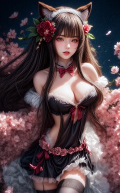 1girl, breasts, solo, animal ears, thighhighs, long hair, hair ornament, looking at viewer, flower, hair flower, large breasts, mole, bangs, cleavage, bare shoulders, medium breasts, parted lips