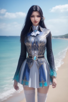 photo_\(medium\),(8k, RAW photo, best_quality),(masterpiece:1.2),(realistic:1.2),(photorealistic:1.3),(ultra-detailed),(extremely_detailed_cg_8k_wallpaper),(crystal_texture_skin:1.3),(shiny:1.2),(shiny_skin:1.4),(extremely_delicate_and_beautiful),shenfengLingLuoChen,1girl,solo,dress,ascot,skirt,torogao,white thighhighs,long sleeves,uniform,zettai ryouiki,standing,jewelry,hair ornament,lips,realistic,looking at viewer,Summer,Beach,Sea,sunshine,<lora:shenfengLingLuoChen_20240512215006-000004:0.7>,