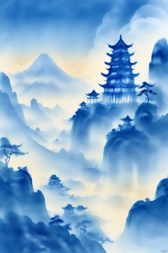 Tie dyeing style, Tie dyeing, outdoors, sky, cloud, tree, no humans, building, scenery, blue theme, mountain, architecture, east asian architecture, fog, Blue tie dyeing
