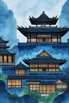 Tie dyeing style, Tie dyeing, outdoors, no humans, traditional media, building, scenery, rain, architecture, east asian architecture, Blue tie dyeing