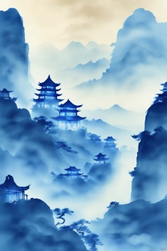 Tie dyeing style, Tie dyeing, outdoors, sky, cloud, tree, no humans, building, scenery, blue theme, mountain, architecture, east asian architecture, fog, Blue tie dyeing