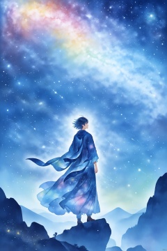 Tie dyeing style, Tie dyeing,Shinkai Makoto style, a whimsical digital illustration of a solitary figure standing on a cliff overlooking the vast starry sky. The figure has a wistful expression, his hair blown by the wind and his robe flowing. The sky is filled with rotating galaxies and constellations, creating a fantastic atmosphere. Bright colors, ethereal lights