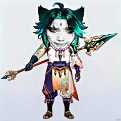 longtu-face,full_body,(masterpiece),(best quality),1boy, solo, xiao \(genshin impact\), weapon, male focus, necklace, polearm, white background, jewelry, holding weapon, simple background, holding, smile, multicolored hair, bead necklace, green hair, full body, gloves, holding polearm, spear, asymmetrical clothes, tattoo, beads, ahoge, standing, closed mouth, bangs, detached sleeves, looking at viewer, facial mark, arm guards
