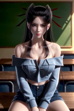 ((HRD, HUD, 8K)),((masterpiece, best quality)), highly detailed,1girl, solo, long hair, black hair, hair ornament, hair stick, black eyes, lips, red lips,(off-shoulder sweater:1.2), denim shorts, blurry background, classroom, chalkboard, sitting, cowboy shot, looking at viewer, <lora:20240516-1715819702586:0.68>