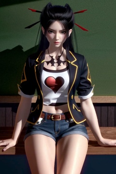 ((HRD, HUD, 8K)),((masterpiece, best quality)), highly detailed,1girl, solo, long hair, black hair, hair ornament, hair stick, black eyes, lips, red lips,(t-shirt:1.2), (blazer:1.2), denim shorts,blurry background, classroom, chalkboard, sitting, cowboy shot, looking at viewer, <lora:20240516-1715819702586:0.7>