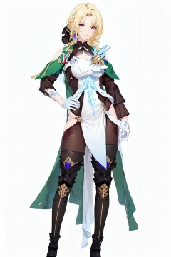 8k,best quality,masterpiece,(ultra-detailed:1.1),(high detailed skin),(full body:1.4),white background,standing,looking at viewer,(solo),hand on hip,<lora:kkly-v100-000029:0.9>,kkly, blonde hair, purple eyes, gloves, thighhighs,boots,(white background, simple background:1.6),(beautiful_face),((intricate_detail)),clear face,((finely_detailed)),fine_fabric_emphasis,((glossy)),full_shot,