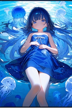 (masterpiece),(best quality),1girl, jellyfish, solo, letterboxed, dress, blue_eyes, blue_hair, lying, barefoot, on_back, strapless_dress, strapless, water, long_hair, bare_shoulders, looking_at_viewer, bare_legs