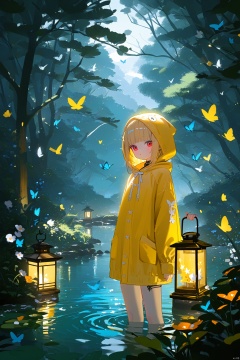1girl, bird, bug, tree, butterfly, red_eyes, lantern, water, hood, solo, flower, outdoors, looking_at_viewer, nature, blonde_hair