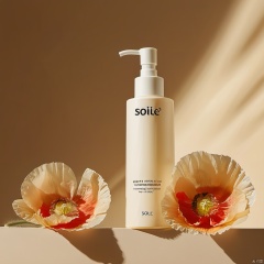 Product photography of a skin care product with flowers on the right side and a beige background. The brand name "SOile" is on a clean bottle body with a white pump head,the text is written in yellow font with no shadow behind it. Soft light shines from top to bottom,creating a warm atmosphere. There were three or four large poppy petals beside the shampoo,adding vitality and freshness. This high-definition photo was taken in the style of professional photographers using Nikon cameras,