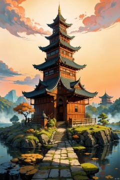 Under the white clouds lies a high mountain jungle in the distance, where there is an ancient building surrounded by a forest. In the autumn season, there is an orange painting style, waterfalls in the mountains, flowing with fine water, and a small path paved with stone slabs. In front of me, there is a thick and large tree, ink paintings, colorful scenes, super detailed skills, optimal proportions, 8K HD, and ultra-high resolution, AI Ink Landscape