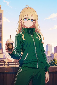 <lora:Eriri-000012:0.8>,eriri cyql,1girl,looking at viewer,solo,blonde hair,long hair,blue eyes,glasses,track suit,track jacket,jacket,pants,socks,track pants,green pants,bespectacled,green jacket,Confused, Wide-open eyes, a slightly furrowed brow, and a slightly open mouth.,cowboy_shot,beautiful face,beautiful eyes,glossy skin,shiny skin,Outdoor coffee market in city, Specialty coffee, Cafes, Vendors, Community,beautiful detailed sky,beautiful detailed glow,posing in front of a colorful and dynamic background,masterpiece,best quality,beautiful and aesthetic,contrapposto,female focus,wallpaper,fashion,
