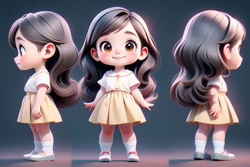 1 girl,short skirt,brown long hair,socks,smile,standing,brown eyes,whole body,simple background,white background,silver,best quality,high-level,kawaii,<lora:kong_三视图_1.0_IND:1>,three views,