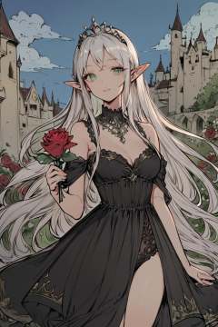 score_9, score_8_up, score_7_up, rating_safe, flat color, 1girl, solo, elf, pointy ears, breasts, long hair, very long hair, white hair, green eyes, portrait, looking at viewer, black dress, tiara, silver tiara, holding, holding flower, rose, red rose, necklace, jewelry, cowboy shot, standing, outdoors, castle <lora:LineArt Mono Style LoRA_Pony XL v6:1>