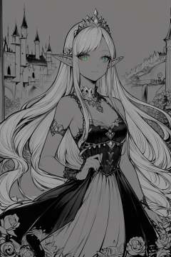score_9, score_8_up, score_7_up, rating_safe, lineart, flat color, monochrome, greyscale, 1girl, solo, elf, pointy ears, breasts, long hair, very long hair, white hair, green eyes, portrait, looking at viewer, black dress, tiara, silver tiara, holding, holding flower, rose, red rose, necklace, jewelry, cowboy shot, standing, outdoors, castle <lora:LineArt Mono Style LoRA_Pony XL v6:1>