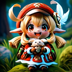 amigurumi-style, amigurumi,masterpiece,best quality,klee, 1girl, klee \(genshin impact\), hat, bag, red eyes, smile, solo, red dress, dress, hat feather, blush, bangs, open mouth, long sleeves, red headwear, backpack, sitting, dodoco \(genshin impact\), outdoors, twintails, blonde hair, looking at viewer, hair between eyes, pointy ears, :d, upper teeth only, feathers, teeth, tree, low twintails, cabbie hat, brown bag, long hair, day, white feathers, sidelocks, eyelashes, object hug, blurry, holding, jumpy dumpty