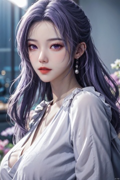 best quality,masterpiece,Yunxiao_Fairy,1girl,solo,long hair,looking at viewer,jewelry,closed mouth,purple eyes,upper body,purple hair,earrings,blurry,blurry background,sunlight,red lips,(big breasts:1.39)