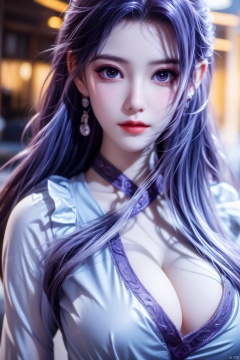 best quality,masterpiece,Yunxiao_Fairy,1girl,solo,long hair,looking at viewer,jewelry,closed mouth,purple eyes,upper body,purple hair,earrings,blurry,blurry background,sunlight,red lips,(big breasts:1.39), Yunxiao_xianzi