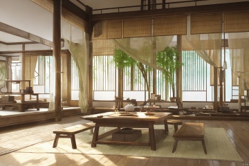 indoors, east asian, 8k, masterpiece, CG, best quality, high detailed, high detailed CG, No logo, no test, no humans, indoors, east asian architecture, short table, big room, scenery, bookshelf, bamboo curtain,