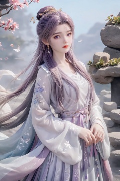 best quality,masterpiece,1girl,solo,long hair,looking at viewer,jewelry,closed mouth,purple eyes,upper body,purple hair,earrings,blurry,blurry background,sunlight,red lips,(big breasts:1.69), Yunxiao_xianzi, Brigitte Lin, X-aurora, pearl_shell, song_hanfu, fantasy_butterfly, Succulent_Plants, traditional chinese ink painting, hanfu, 2.5D