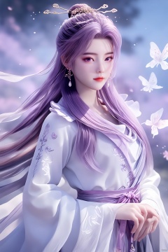 best quality,masterpiece,1girl,solo,long hair,looking at viewer,jewelry,closed mouth,purple eyes,upper body,purple hair,earrings,blurry,blurry background,sunlight,red lips,(big breasts:1.69), Yunxiao_xianzi, Brigitte Lin, X-aurora, pearl_shell, song_hanfu, fantasy_butterfly, Succulent_Plants, traditional chinese ink painting, hanfu, 2.5D, Ancient costume, Film Photography, film1,Film texture