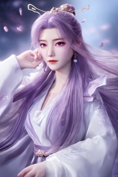 best quality,masterpiece,1girl,solo,long hair,looking at viewer,jewelry,closed mouth,purple eyes,upper body,purple hair,earrings,blurry,blurry background,sunlight,red lips,(big breasts:1.69), Yunxiao_xianzi, Brigitte Lin, X-aurora, pearl_shell, song_hanfu, fantasy_butterfly, Succulent_Plants
