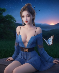 <lora:571-DA-XL-眷思量-奉眠:0.8>(,1girl, ,best quality, ),looking at viewer,  ,ultra detailed background,ultra detailed background,ultra realistic 8k cg, ,masterpiece, (( , )),,  fiction,mole, , ,      ,, 1girl,butterfly sitting,  night, star_\(sky\)(cleavage),