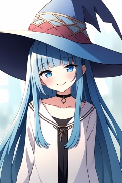 :),Shy,blushing,half-closed eyes,masterpiece,best quality,(1girl),( long blue hair),blunt bangs,blue eyes,witch hat,head tilt,albino,[watercolor],choker,<lora:Rabbit_B:0.3>,
