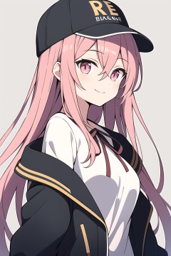 Best-A,ru_zhai-A,illustration,simple background,upper body,1girl,solo,pink eyes,long hair,bangs,hair between eyes,medium breasts,looking at viewer,looking to the side,closed mouth,smile,very long hair,pink hair,black headwear,(neck ribbon:1.1),open clothes,t-shirt,(white shirt:1.1),hat,cabbie hat,baseball_cap,off shoulder jacket,open jacket,jacket,(black jacket:1.1),<lora:Rabbit_B:0.3>,