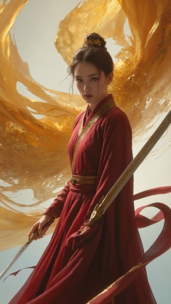 ultra high resolution,(((masterpiece))),(((best quality))),((super detailed)),((extremely delicate and beautiful)),cinematic light,detailed environment,(real),(1girl, solo, male focus:1.3),(holding sword:1.2),(dark red and light gold:1.3),(hair pulled back, floating hair:1.1),designed by greg manchess,smoke,a model woman,bright eyes,glossy lips,futuristic gold face war paint,trending on art station,photoreal,8 k,octane render by greg rutkowski,art by Carne Griffiths and Wadim Kashin,in the style of Dau-al-Set,Pollock,and inspired by MAPPA and Zdzislaw Beksinski,hanfu,