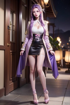 Sunshangxiang,1girl,solo,long hair,skirt,purple hair,multicolored hair,coat,pink footwear,personification,long sleeves,shoes,jewelry,gradient hair,looking at viewer,pink hair,boots,, (raw photo:1.2),((photorealistic:1.4))best quality,masterpiece,illustration,an extremely delicate and beautiful,extremely detailed,CG,unity,8k wallpaper,Amazing,finely detail,masterpiece,best quality,official art,extremely detailed CG unity 8k wallpaper,absurdres,incredibly absurdres,huge filesize,ultra-detailed,highres,extremely detailed,beautiful detailed girl,cinematic lighting,1girl,pale skin,tall female,(perfect body shape),skinny body,Slender legs, caiyi, black pantyhose